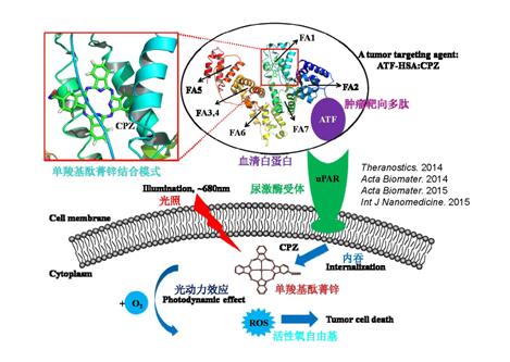 圖3. Bifunctional drug carrier ATF-HSA targets to tumors through tumor marker (urokinase receptor, uPAR) and enhanced permeability retention (EPR) effect, and demonstrated enhanced photodynamic therapeutic (PDT) effect. ATF-HSA also carries diagnostic and cytotoxic agents (CPZ in this case) to destroy and/or detect tumor cells.