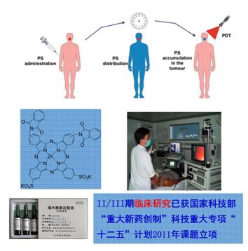 1.光動力治療:光動力治療(Photodynamic Therapy, PDT)是一種治療疾病的新方法,該方法是通過光敏藥物與特定波長的光及氧的配合產生細胞毒劑,對病變細胞及組織產生殺傷作用。PDT與經典的治療疾病方法相比,具有靶向性、微創、非侵蝕性、無耐藥性、可多次使用等優勢,近年來備受矚目。本中心合成了系列光敏劑,其中“福大賽因”為1.1類光動力抗癌新藥、正在開展II期臨床試驗。