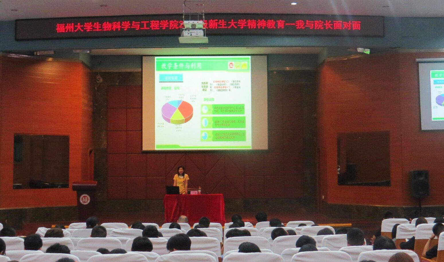 會議開始,汪少蕓教授對全體新生的到來表示熱烈的歡迎。隨后汪少蕓教授以師資隊伍、教學條件等為切入點詳細的講述了學院的概況,讓同學們對學院有一個初步的了解。緊接著,汪院長介紹了我院人才培養的過程、在各種科技創新活動上獲得的榮譽和優秀校友的事跡,鼓勵新同學在校期間積極參與各項活動,鍛煉自己的創新及科研能力。會議的最后,汪院長再次闡述了學院優秀的教學質量及科研條件,提到“生物科學與工程學院是無悔的正確選擇”,并對新生寄予美好的祝福和鼓勵。