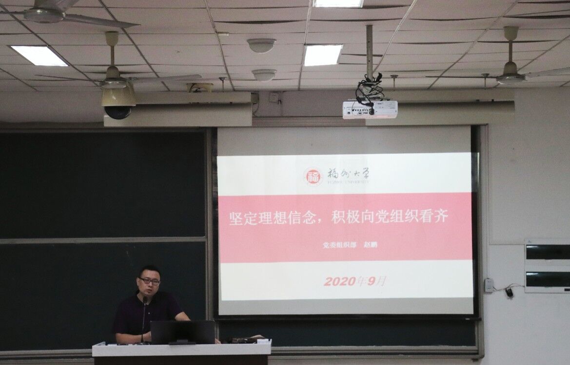 趙鵬老師首先就什么是入黨動機、黨員應該具備怎樣的品質以及入黨的流程等方面進行了詳細地介紹,使同學們對入黨的流程有了基本的認識。隨后趙鵬老師從“黨事業的發展需要青年”、“青年的前途在黨的正確領導”、“青年成長離不開黨的培養”、“爭取入黨有利于全面發展”這四個方面鼓勵新生們爭取早日入黨。最后趙鵬老師希望新生們能夠在大學這個的新起點里,早找到自己奮斗的方向,堅定理想信念,積極向黨組織看齊。