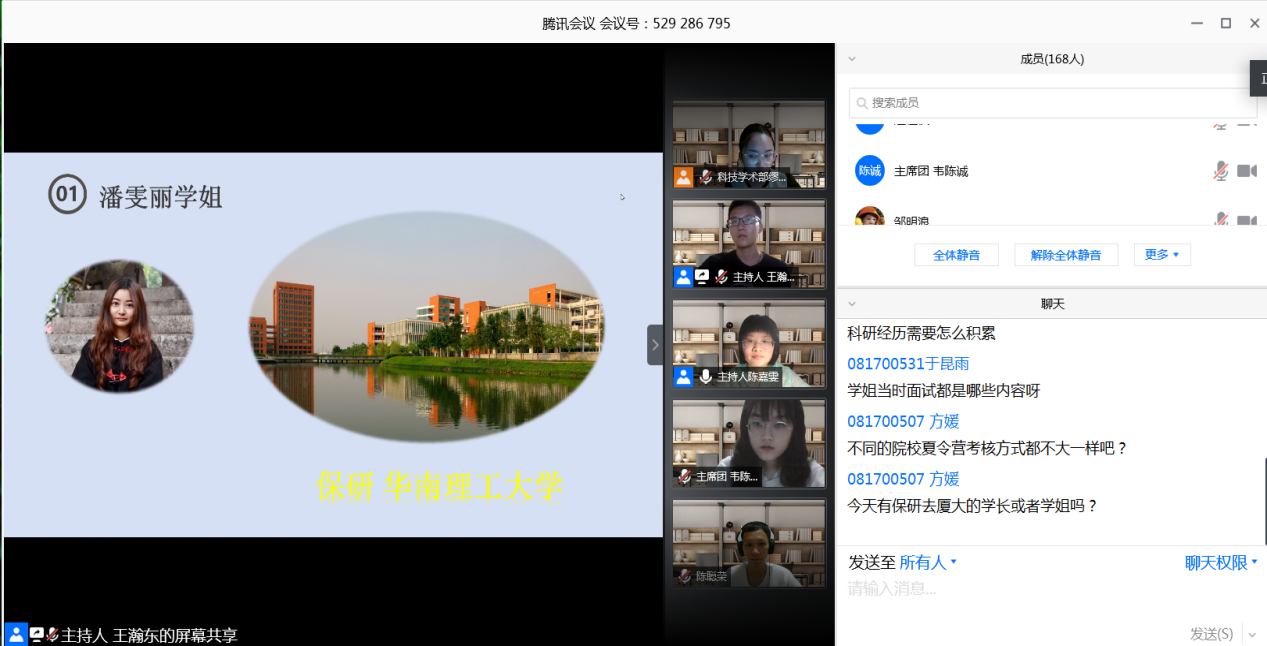 為使同學們更加充分地了解考研信息,幫助同學們解決考研過程中遇到的問題,6月12日晚,生工學院借由騰訊會議平臺,舉辦了2020年考研經驗分享會,此次網絡分享會由院學生會科技學術部主辦,陳佳雯和王瀚東同學主持,學院黨委曹仁秋副書記、團委書記周越老師,輔導員林婧燁老師,以及七位考研成功的2016級學長學姐參加,會議在線人數達到近200人。