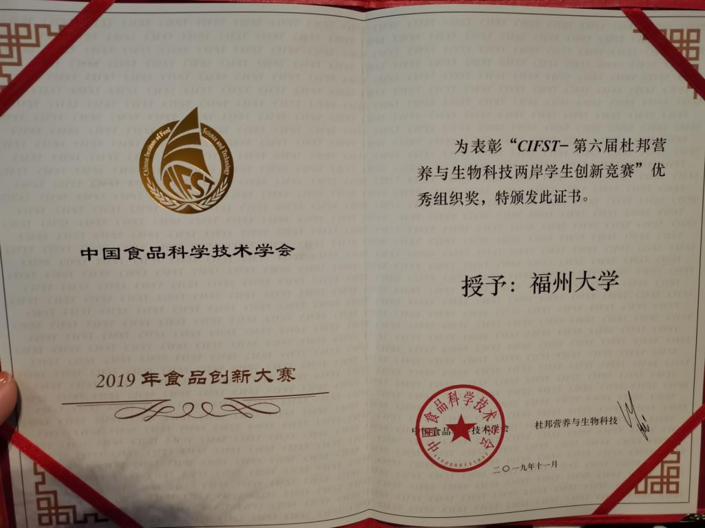 其中,在“CIFST-第六屆杜邦營養與生物科技兩岸學生創新競賽”中福州大學獲得優秀組織獎;我院作品《朋克養生系列功能型飲料》(王子銘、劉婧懿、陳德偉、盧雯雯、賈懿)獲得最佳創意獎;作品《春日留香 茶醬》(念希銘、楊瑾燁、劉雨薇、陳儀)獲得一等獎: