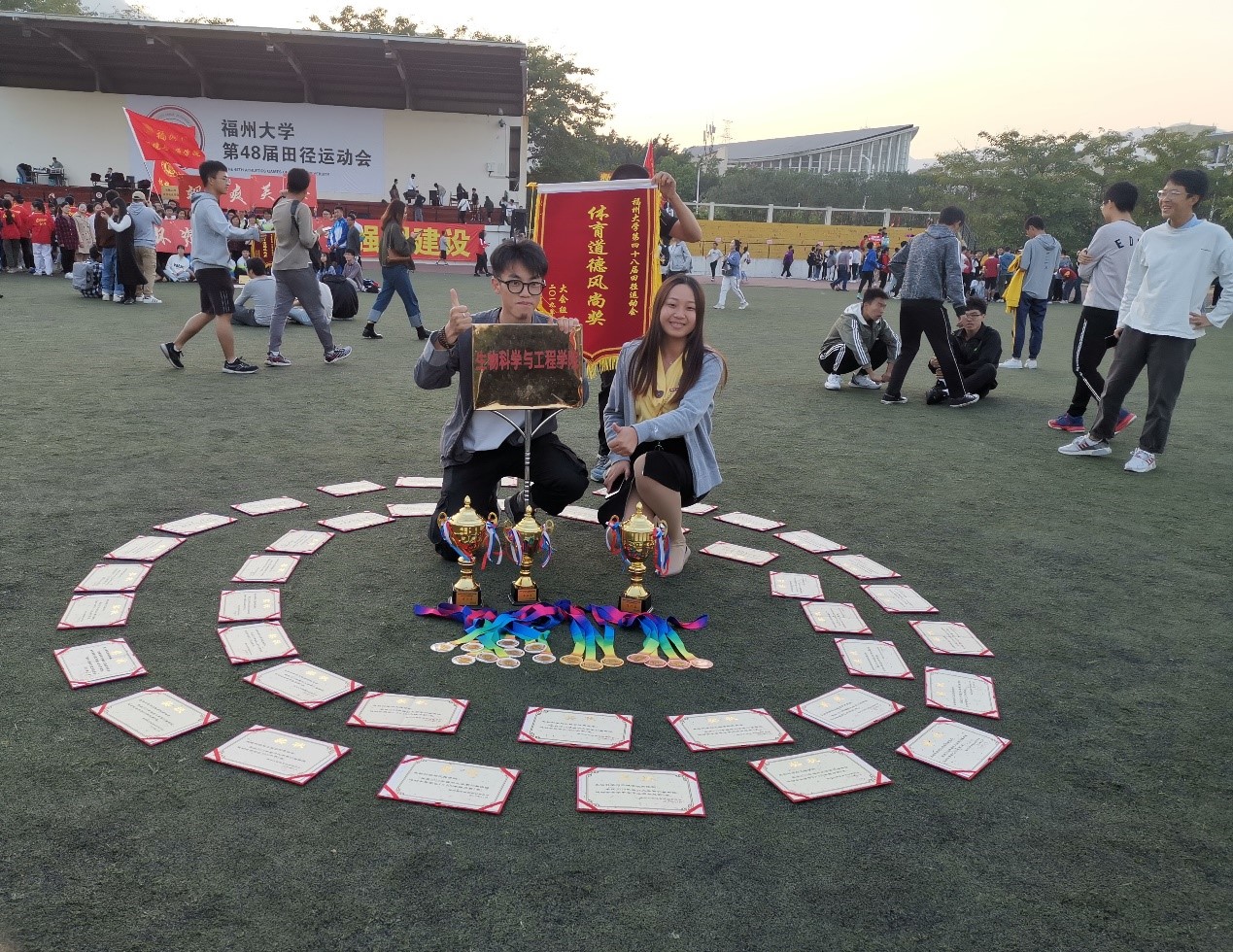 “群雄逐鹿,鋒芒畢露,唯我生工,賽場稱雄”本次運動會獲得如此佳績,是各位老師同學們奮力拼搏,不懈努力,默契配合取得的;是后勤人員默默奉獻,堅守崗位取得的;是拉拉隊員們激情助威取得的。生工學子本著“友誼第一,比賽第二”的精神,共同完成了一個團結共進的舞臺。相信在全校師生的共同努力下,生工學院必會飛向更美好的明天。