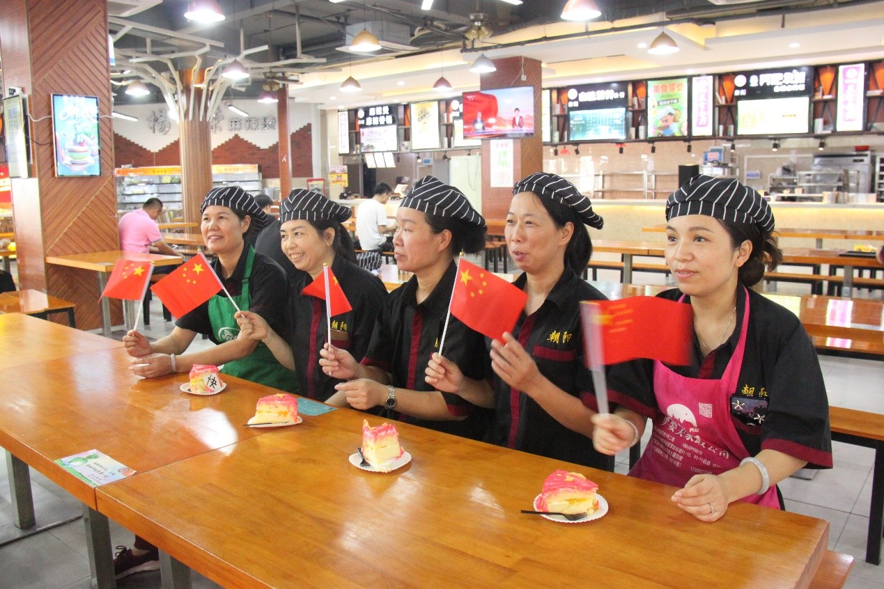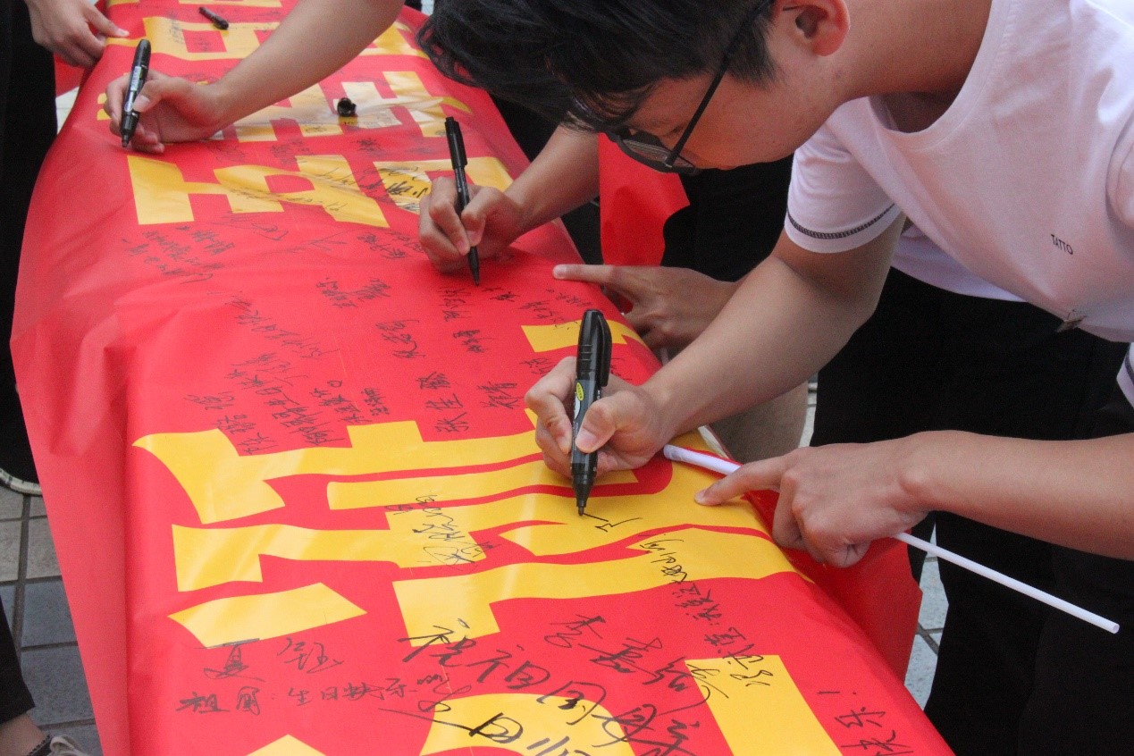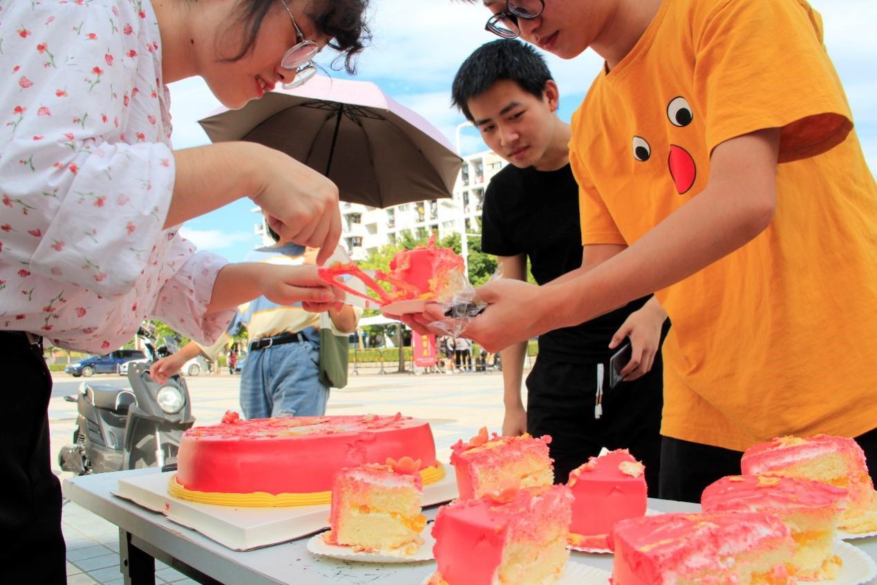 青春廣場上,生工學子拉起了"盛世華誕,吾輩自強"的橫幅,并在橫幅上自豪的寫下了對祖國最真摯的祝福,希望我們的中國永遠繁榮昌盛。同學們也精心的為學校的老師、樓管阿姨、食堂阿姨、保安叔叔等送上國慶主題蛋糕,邀請他們一起說出對祖國真摯的祝福,為新中國成立70周年送上祝福,向他們的辛勤與堅持致敬。
