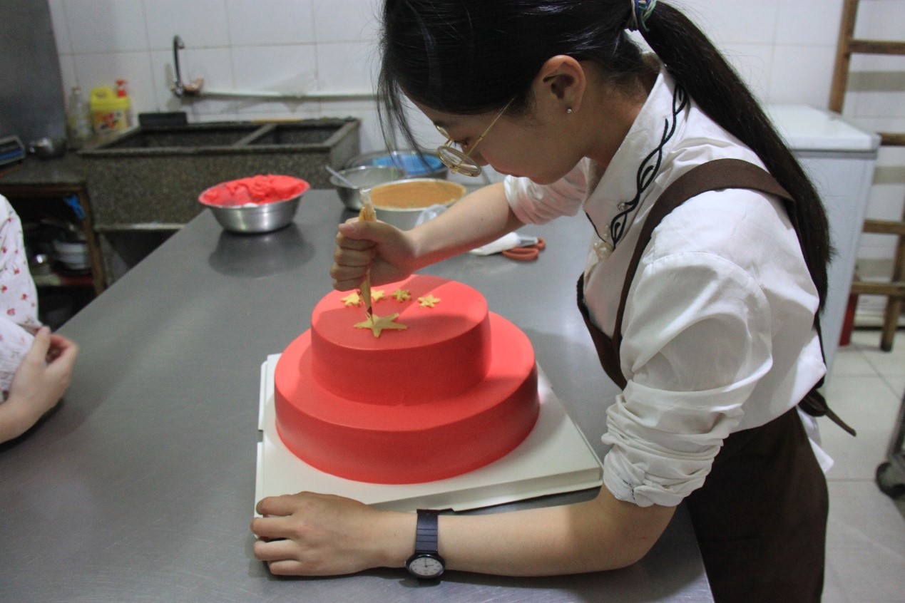 9月30日傍晚,生工學院學子們利用學科專業知識與特長,親手烘焙制作了一個國慶主題蛋糕。