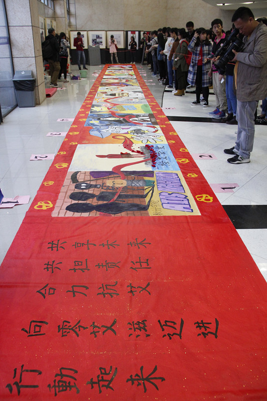 11月29日下午,福州大學校紅十字會在福州大學圖書館福萬廣場舉行了防治艾滋病主題系列活動之“百米畫卷”,活動以“繪愛會愛”為主題,以學院為單位,進行2個小時的現場作畫。生物科學與工程學院紅十字會代表隊以“母嬰傳播”為出發點,繪制以“愛No艾”為主題的畫卷。