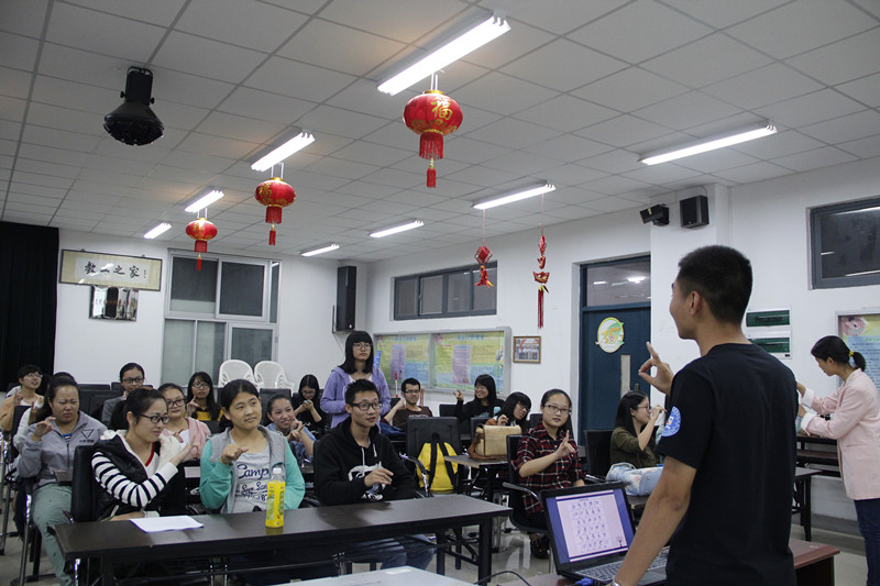 部員李世偉為大家講解手語中二十六個字母的表示方法,通過用簡單形象的手勢,激起大家學習的興趣。為了加強記憶,張文瑞帶領大家參與到“時間炸彈”的游戲中,從左到右,每個人依次用手指表示二十六個字母,如果忘記字母的表示方法,則需要到講臺上做自我介紹。通過大家互相交流手語的用法,整個課堂氣氛活躍。最后由沈慧瑜對大家進行一些簡單日常問候和介紹用語的培訓,如“你好”“謝謝”“我叫……”等,她形象化的講解讓大家帶著好奇與激動的成就感紛紛融入到手語培訓之中。