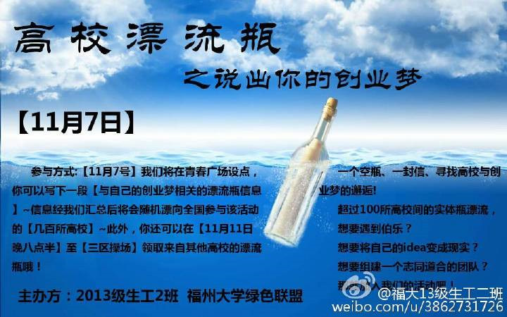 為更好貫徹落實李克強總理關于“大眾創業,萬眾創新”的號召,向同學們傳遞創新理念以及最新的創業政策11月1日至11日,13級生工2班聯合綠色聯盟開展高校漂流瓶之說出你的創業夢活動,通過收集同學們的創業夢以漂流瓶的形式向全國各大高校的大學生傳遞創新理念以及創業政策,為創新創業事業添磚加瓦。