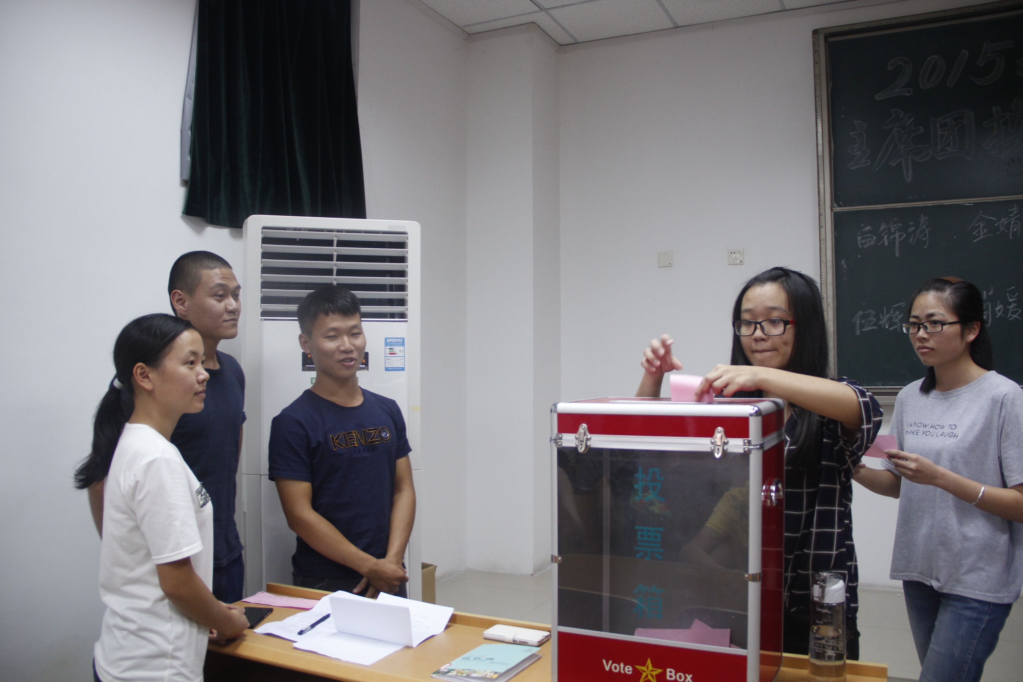 本次競聘演講共有四個議程,分別為主席團成員宣讀選舉規則,競聘者演講,投票以及唱票。7位競聘者依次上臺展示,每個人表現都很優異。白錦濤的真誠;金婧的小清新;落落大方的桂梅;青春無限的肖媛;經驗豐富的吳西蒙;幽默風趣,創意無限的劉永銘;踏實努力的伍輝。競聘者用言語盡情展示自己的個人魅力,臺下觀眾掌聲不斷。演講結束,監票人向觀眾分發投票券,本次投票為7選5,否則則視為廢票。投票結束后便進行激動人心的唱票。經過監票人的現場統計,最終吳西蒙,劉永銘,周桂梅,金婧,伍輝脫穎而出成為15屆主席團成員。鄭延平書記做了本次競聘演講的總結,祝賀成為主席團成員的五位同學,并告誡競聘者不要太注意結果,享受過程才是最重要的。