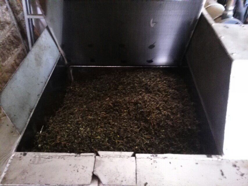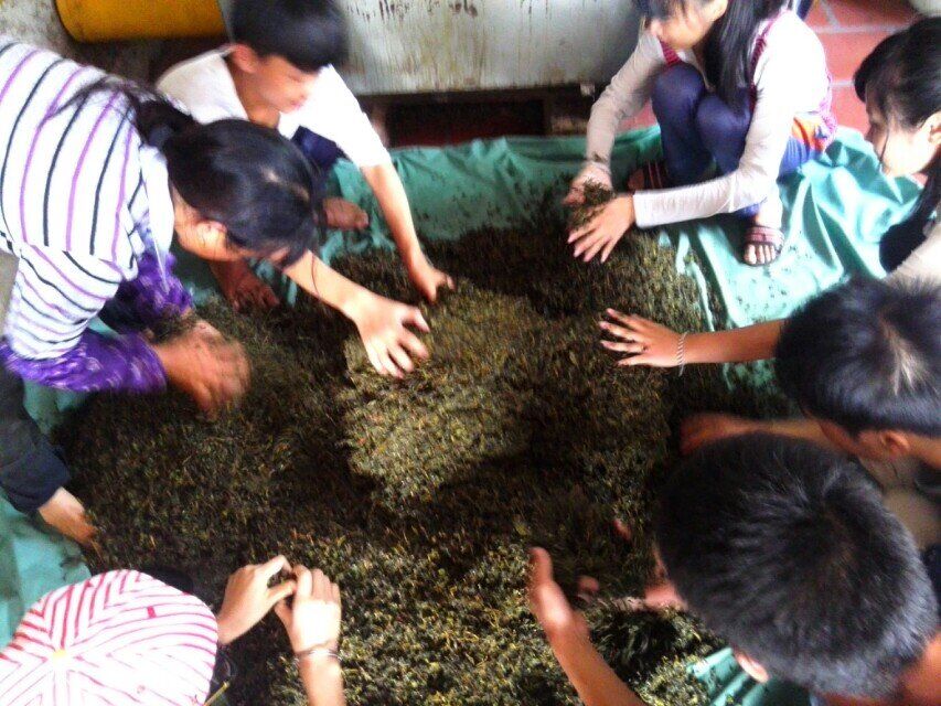 第三天我們又來到茶農家,向茶農了解其他加工步驟的具體操作。經過一個晚上的發酵,接下去就是殺青,殺青是制茶最關鍵的一步。經過殺青把發酵后的生茶葉加工成為熟茶葉。殺青時需要特別注意火候的控制,火太大做出來的茶葉會有火味,有可能蓋過茶味,火太小茶葉則會因在冷火下太久,葉片會變成紅色,之后做出來的茶葉要么茶末很多要么色澤很差。殺青后便進行揉捻。揉捻最初全部是用人工做出來的,耗費人力,而且勞動效率很低。茶農告訴我們,隨著時代的進步,機械逐漸代替了手工。液壓速成機代替了人力勞動,大大減少了人力物力。經過揉捻后的茶葉形成一塊十分緊密茶餅。再將茶并重新打散。之后經過反復幾次的揉捻和打散,扁平的茶葉逐漸卷曲變成圓球狀。這時的茶葉已經形成我們在市場上看到的形狀。但是還有最后一步,茶葉還要在烘干機中進行烘干。茶葉的制作過程需要經過這樣反復的幾次加工,最終才會成為市場上銷售的茶葉。