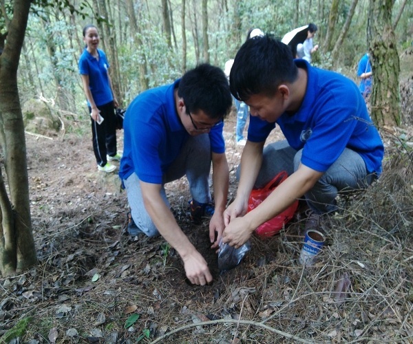 清晨五點多,實踐隊隊員們便起床趕往千畝山茶油基地。關于基地名字的由來,周經理解釋說茶油基地創建于1958年,正值大躍進時期,為了達到上級規定的農作物產量的要求才取了這名字。經過一段崎嶇的山路,實踐隊到達了千畝山茶油基地,基地有成片的油茶樹林,均不施農藥和化肥。油茶樹的種籽目前大約有半根拇指大小,生長良好,將會用于榨取山茶油。山茶油是我國最古老的木本食用油之一。而方家山村的千畝山茶油基地憑借著得天獨厚的土地氣候優勢,生產出的山茶油為純天然綠色食用油,營養豐富,價格為三百元一斤。油茶樹林旁邊有一些空置的相對平坦的土地,周經理說會盡快開發出來,種植水稻。在參觀千畝山茶油基地的過程中,細心的隊員還采集了基地土壤樣品,實踐結束后帶回學校進行檢測分析,為后續油茶大規模開發提供相應的技術支持。