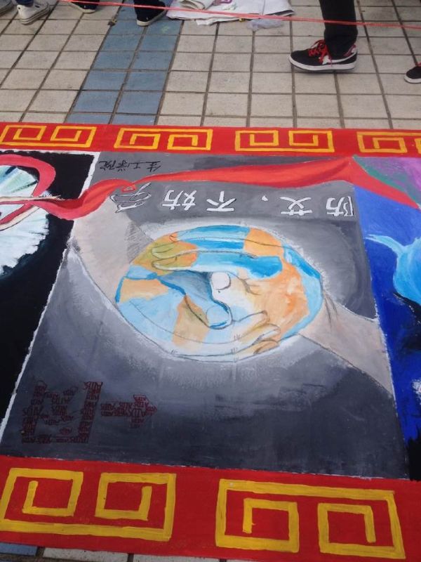 生工紅十字會會長葉沁帶領部員攜手宣傳部一起完成了這次比賽。作畫過程中,在宣傳部部長王藝靜的帶領下,參賽人員積極參與作畫,分工有序。王藝靜部長介紹,畫面上方奔跑的小人沖破濃密的艾滋屏障,找到出口,這表達了我們對同學們能夠身體力行,多了解艾滋并有效預防艾滋的一份希冀。下方是兩只相握的手,他們來自不同的方向,跨越地球卻依舊能夠給予彼此力量。飄揚的紅絲帶與愛相融,無限蔓延,感染著你,感染著我,感染著我們身邊的每一個人。這幅畫緊緊地扣住了“艾滋病歧視問題”的主題,表達了艾滋病人沒有什么不同的理念。