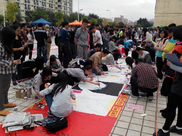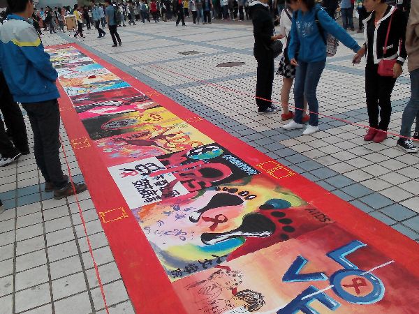 11月23日上午,福州大學校紅十字會在一區青春廣場舉行了防治艾滋病主題系列活動之“百米畫卷”,活動以學院為單位進行,每個學院組成一支代表隊,在2個半小時內現場完成作畫。生物科學與工程學院紅十字會代表隊抽簽所得繪圖主題是“艾滋病歧視問題”。