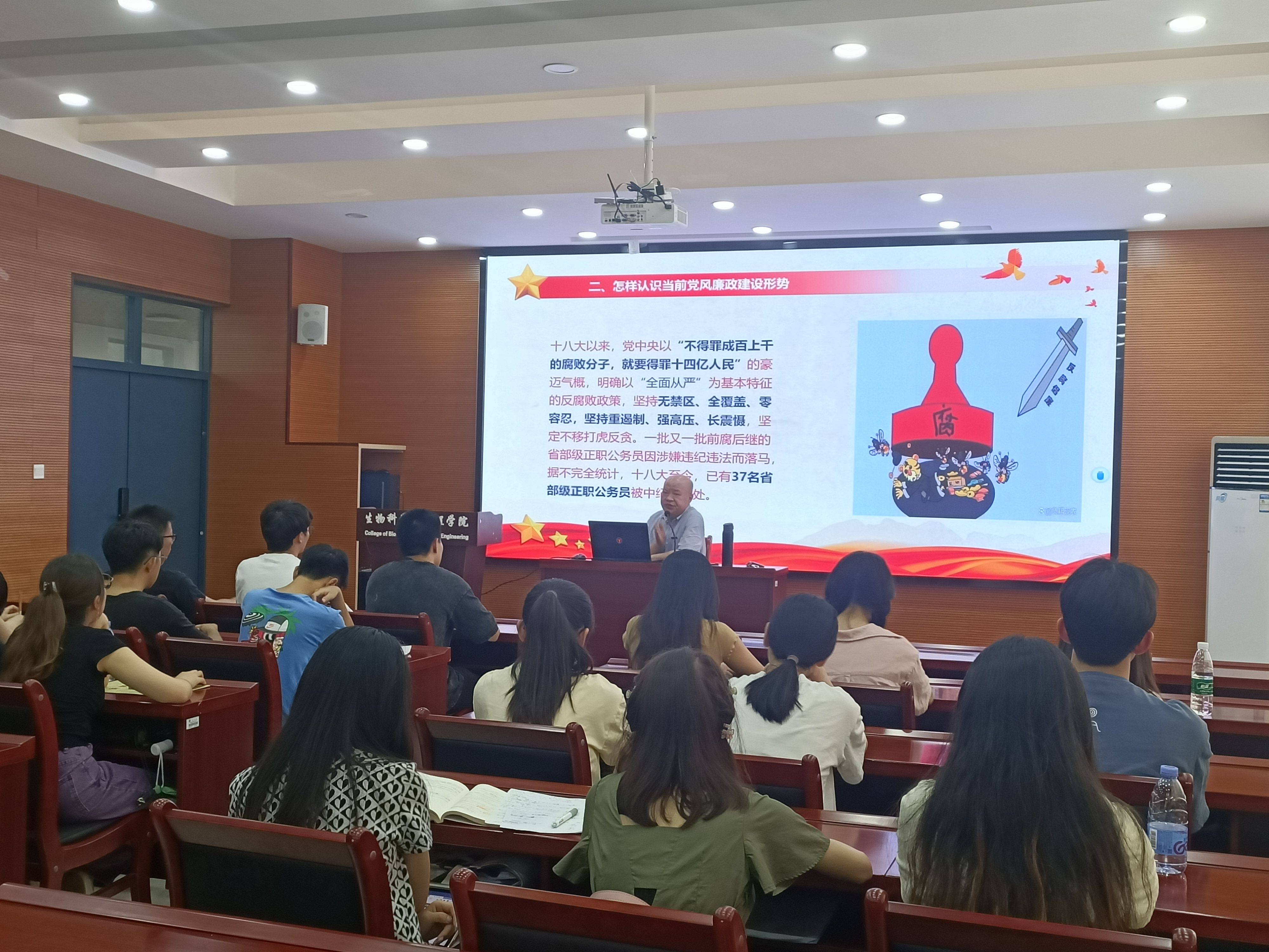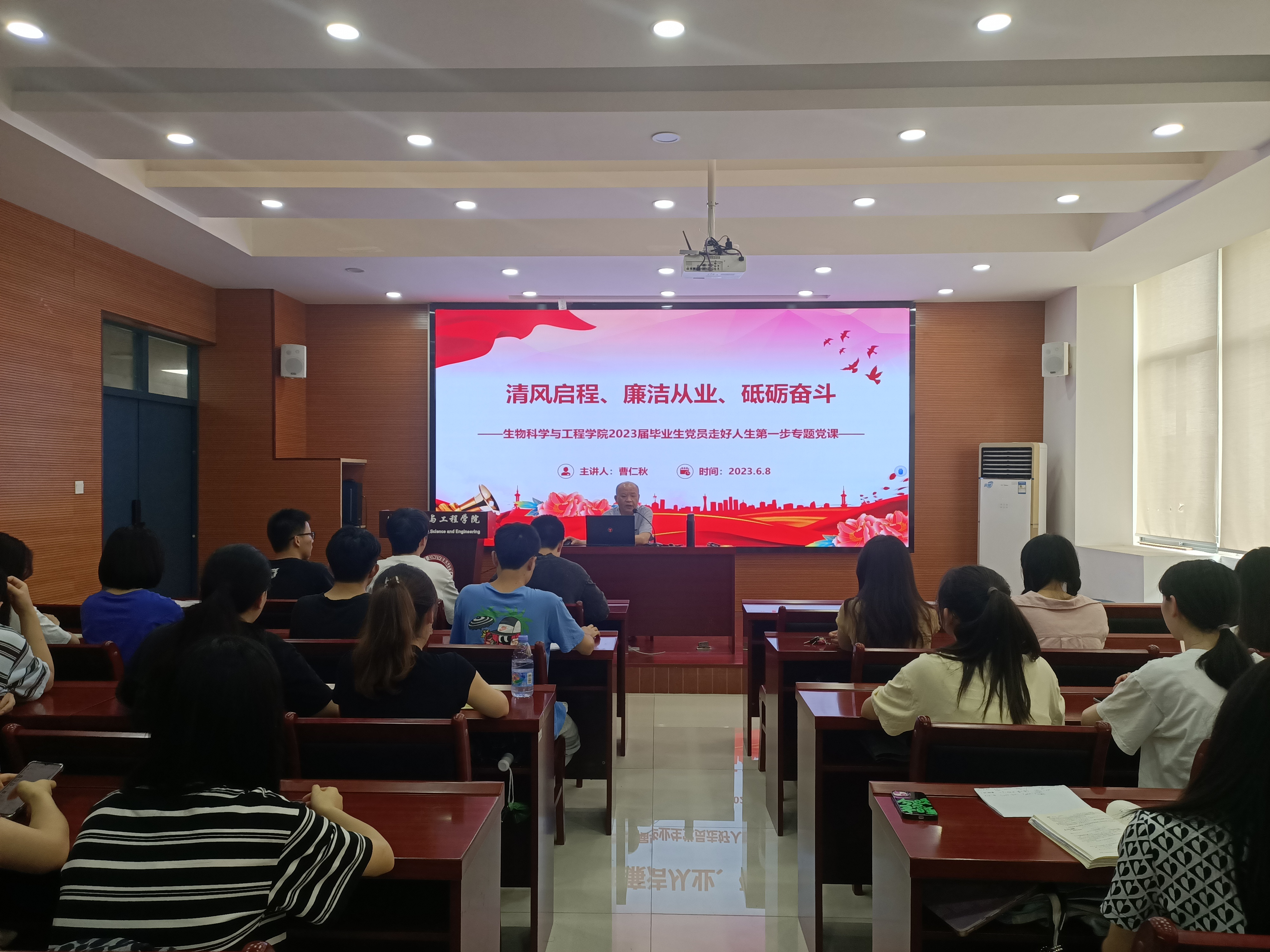 為深入學習貫徹習近平新時代中國特色社會主義思想和黨的二十大精神,持續深入推進主題教育,扎實開展畢業生黨員黨章黨規黨紀教育,切實引導畢業生黨員堅守政治定力、增強黨性修養,6月8日下午,生物科學與工程學院2023屆畢業生黨員專題黨課在柏物產廳舉辦。院黨委副書記、紀委書記曹仁秋以《清風啟程、廉潔從業、砥礪奮斗》為主題,為畢業生黨員講授離校前最后一堂黨課。
