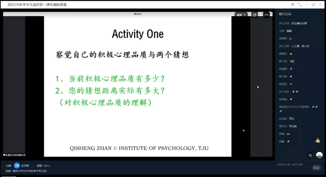 詹教授以“心理教育”為主題,結合大學生日常生活,從積極心理學角度展開闡述,為各位新生介紹了積極心理學的一些方法和作用,從而幫助同學們在接下來的大學生活中明確方向,努力奮斗,實現人生的價值。