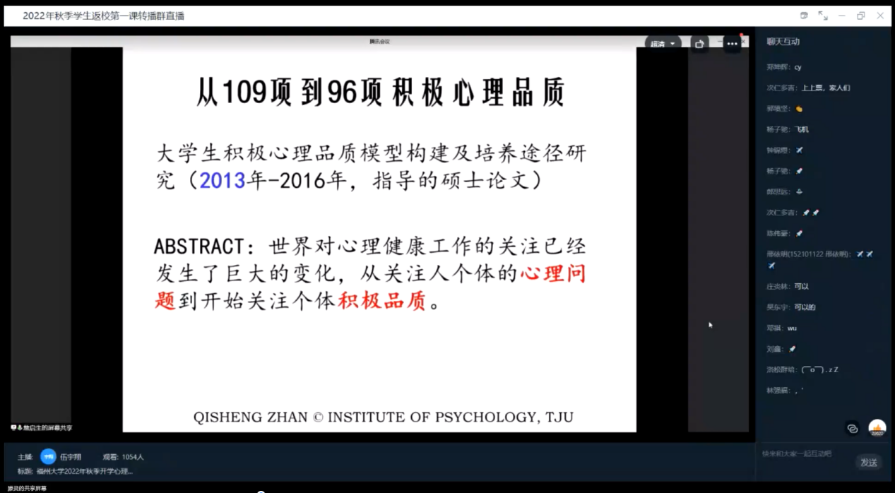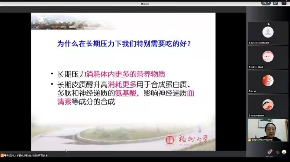 9月2日晚,福州大學人文學院趙陵波教授通過線上直播方式舉辦心理健康講座,從“心”出發,為研究生新生做好心理調適,幫助研究生新生提升心理健康素養,加快適應新階段的學習生活。講座中,趙陵波教授羅列學習、生活中可能面臨的壓力,并剖析其成因,幫助學生提前做好相應的心理建設。隨后他指出,讀研最重要的就是心態,并為同學們傳授應對壓力與促進心理健康的具體策略。