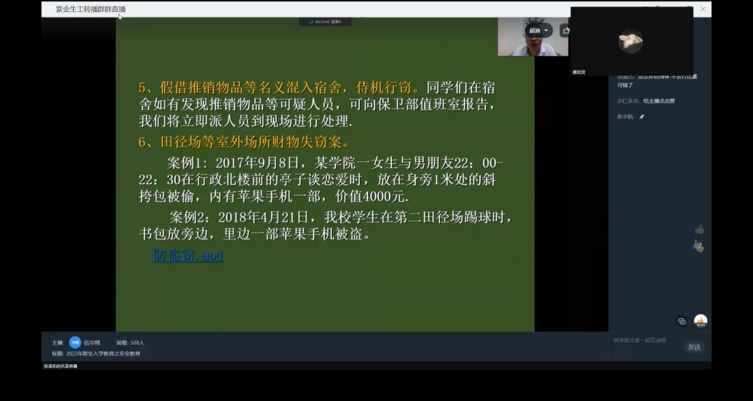 江宏老師以“安全教育”為主題,通過列舉高校真實案例、播放典型案例視頻等方式向新生充分講解了防盜、防騙、防火、交通安全等多方面的安全問題,提醒新生時刻保持警惕。