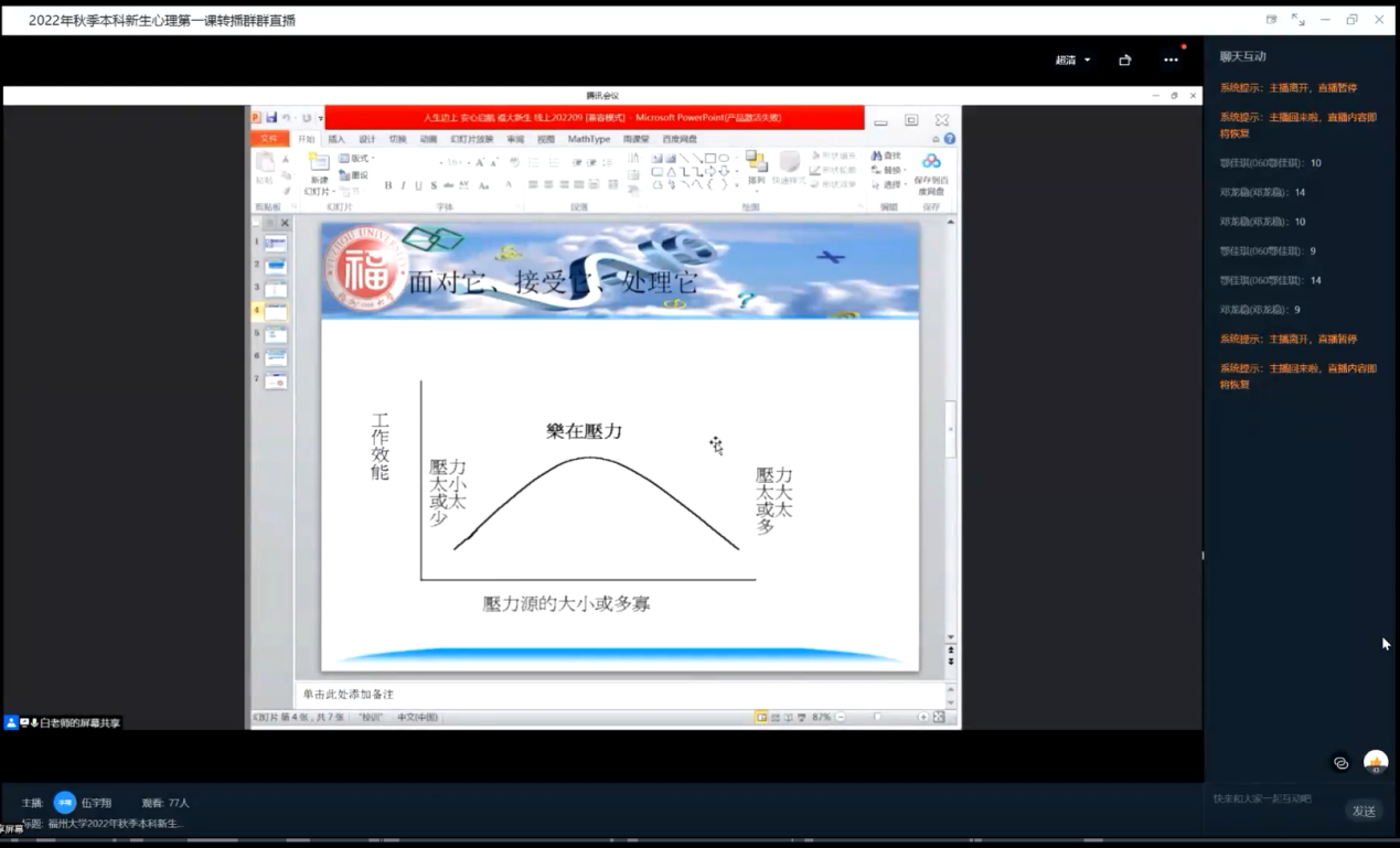 9月5日晚,白麗英老師通過騰訊會議在線上為2022級本科新生開展了一場關于幸福與熱愛的心理教育講座。講座上,老師以一條壓力曲線為引,通過疫情當下人們的心理以及學生們在學習上工作上的行為模式,講解了當代青年在生活學習中遇到挫折與煩惱時調節心理狀態的方法。希望通過此次講座,同學們能夠自我調控,以更加良好的狀態迎接即將到來的大學生活。
