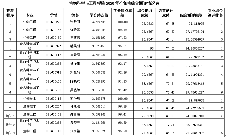 二、經符合條件的學生自愿申請,學院復試小組面試考核,學院推免生遴選工作領導小組討論,現將獲得推免生資格名單予以公示,公示時間:2019年9月17日至2019年9月19日,若有疑議,請撥打電話:13509369204孟春老師或撥打電話:22866277郭文鋒老師反饋。綜合測評成績由三個部分構成:學分績點成績、綜合能力成績及德育測評成績。權重的構成情況是:學分績點成績占總成績的權重是80%,綜合能力成績占總成績的權重是15%,德育測評成績占總成績的權重是5%。即:綜合測評成績=(被推薦學生學分績點值/本專業第一名學生學分績點值)×100×80%+綜合能力成績×15%+德育測評成績×5%。綜合測評成績公示如下: