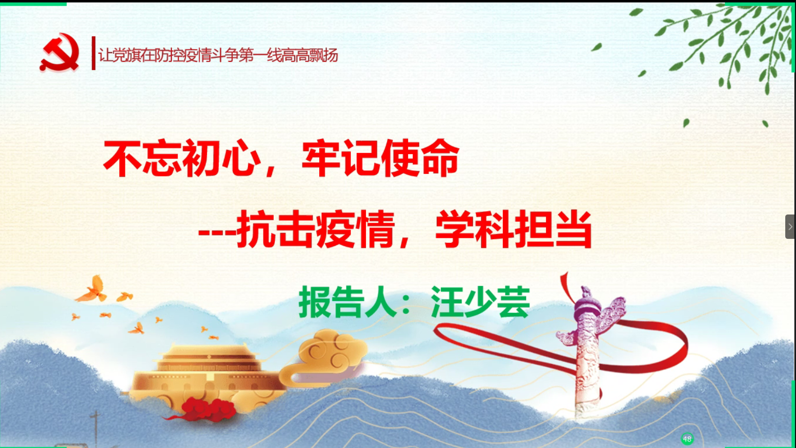 課堂上,汪院長從“不忘初心,牢記使命”、“堅持發揚黨的優良傳統和作風”、“抗擊疫情,學科擔當”三個方面對此次主題黨課展開講述。她強調,共產黨員要充分發揮模范帶頭作用,主動承擔學校分配的各項工作任務,毫不放松地打贏疫情防控大考之戰。在抗擊疫情的同時,要堅持實事求是,密切聯系群眾,繼續艱苦奮斗;要在實踐中不斷提升工作的本領和能力,運用自身學科優勢積極參與抗疫。