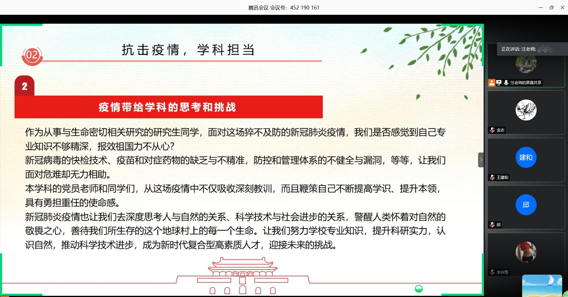 授課過程中,汪院長與黨員積極互動,并鼓勵同學們根據實際情況做好專業課學習、抓好科研工作等。此次線上主題黨課增強了黨員們的責任心和憂患意識,也堅定了黨員們學好自身專業知識的決心。