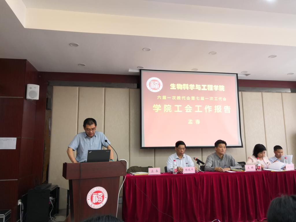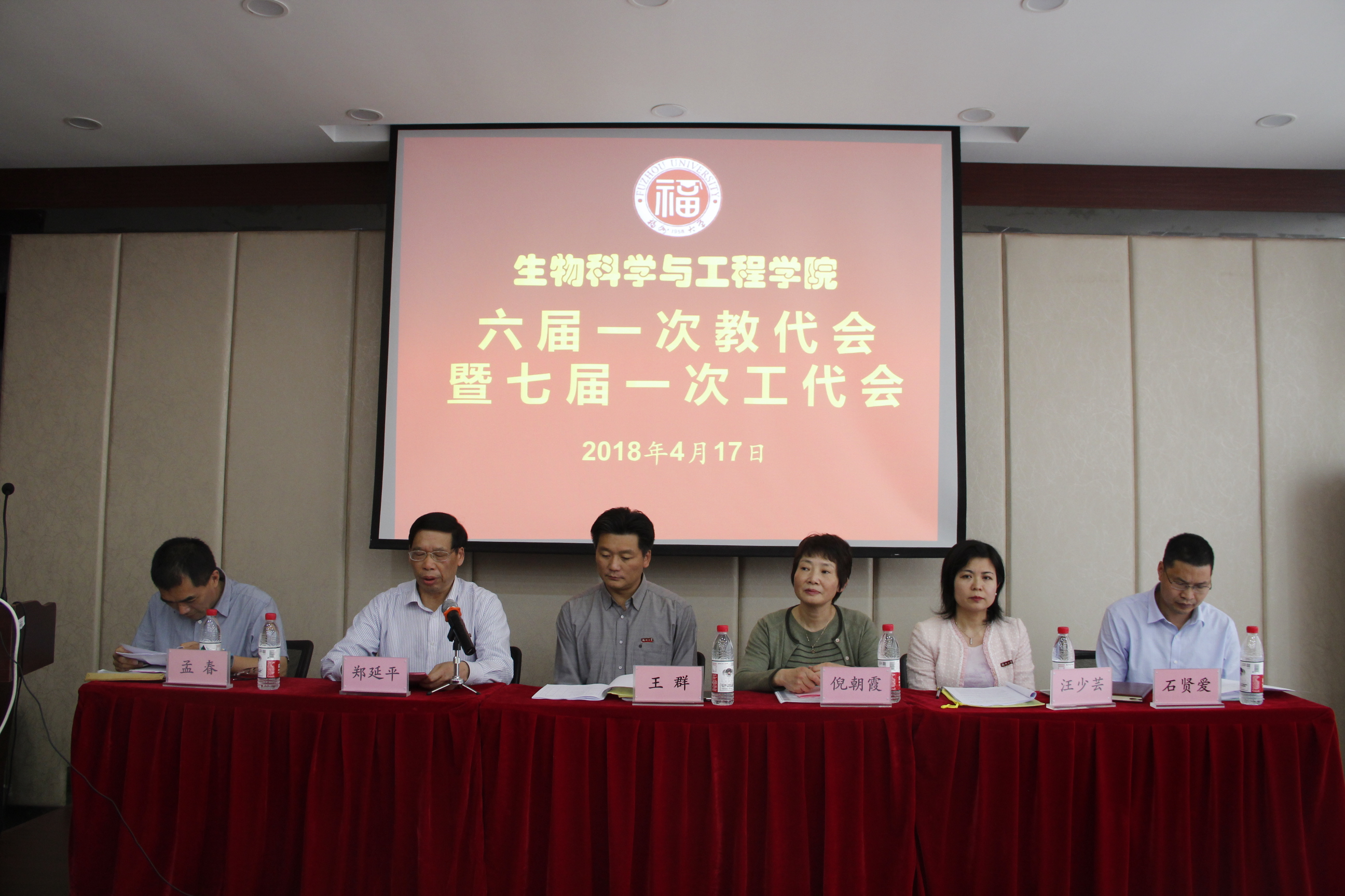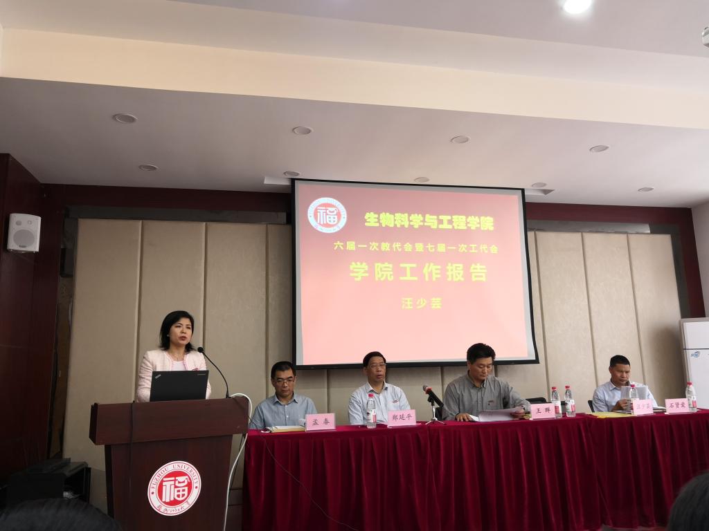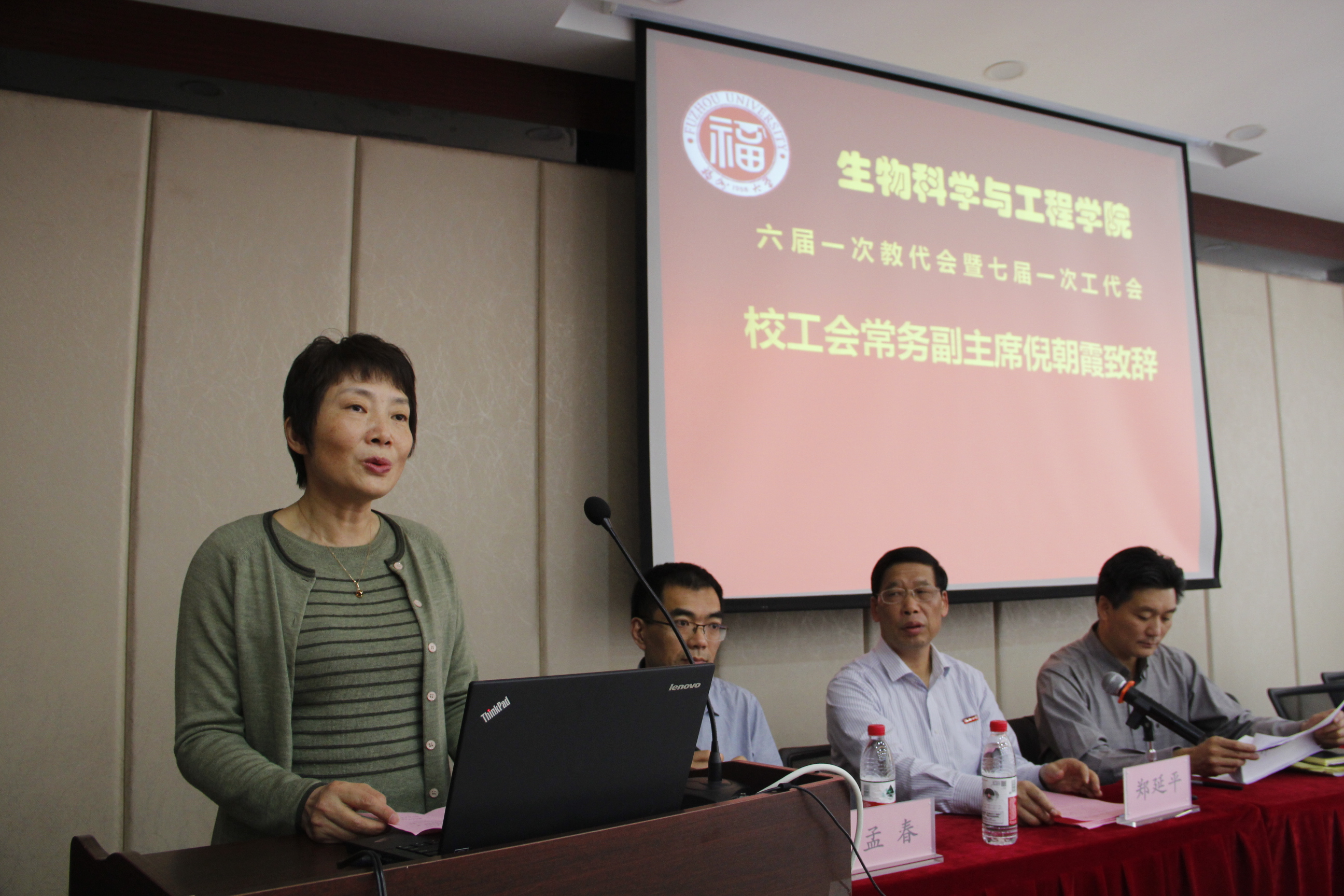 2018年4月17日,福州大學生物科學與工程學院第六屆教職工代表大會第一次會議暨第七屆工會會員代表大會第一次會議在生工北樓柏物產學術報告廳舉行。大會由院黨委鄭延平副書記主持。校工會常務副主席倪朝霞研究員應邀出席了大會。