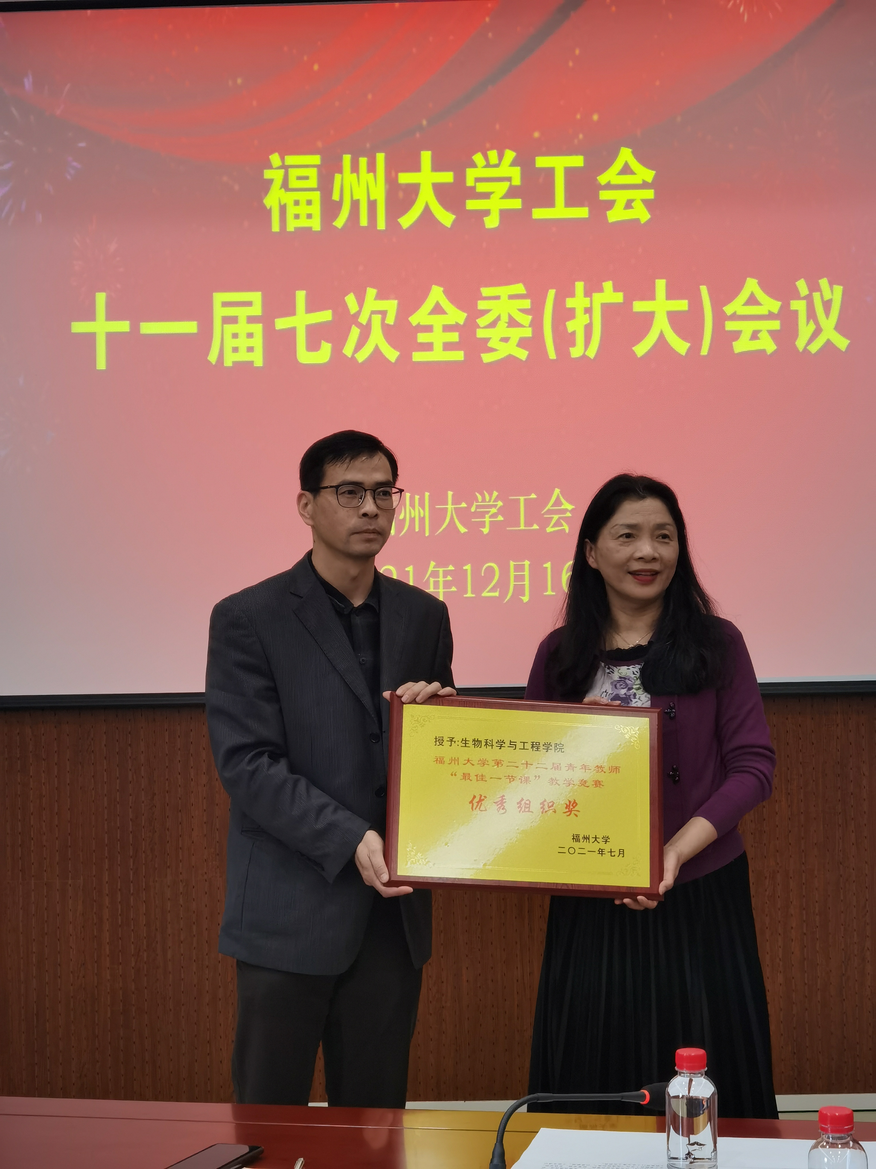 由校工會、教務處主辦的福州大學第二十二屆青年教師“最佳一節課”教學競賽優秀組織獎近日揭曉,我院憑借優秀的組織工作和良好的競賽成績,成為四個獲獎單位之一。學院工會主席張志雄老師從校工會常務副主席程玉敏老師手中接過獎牌。