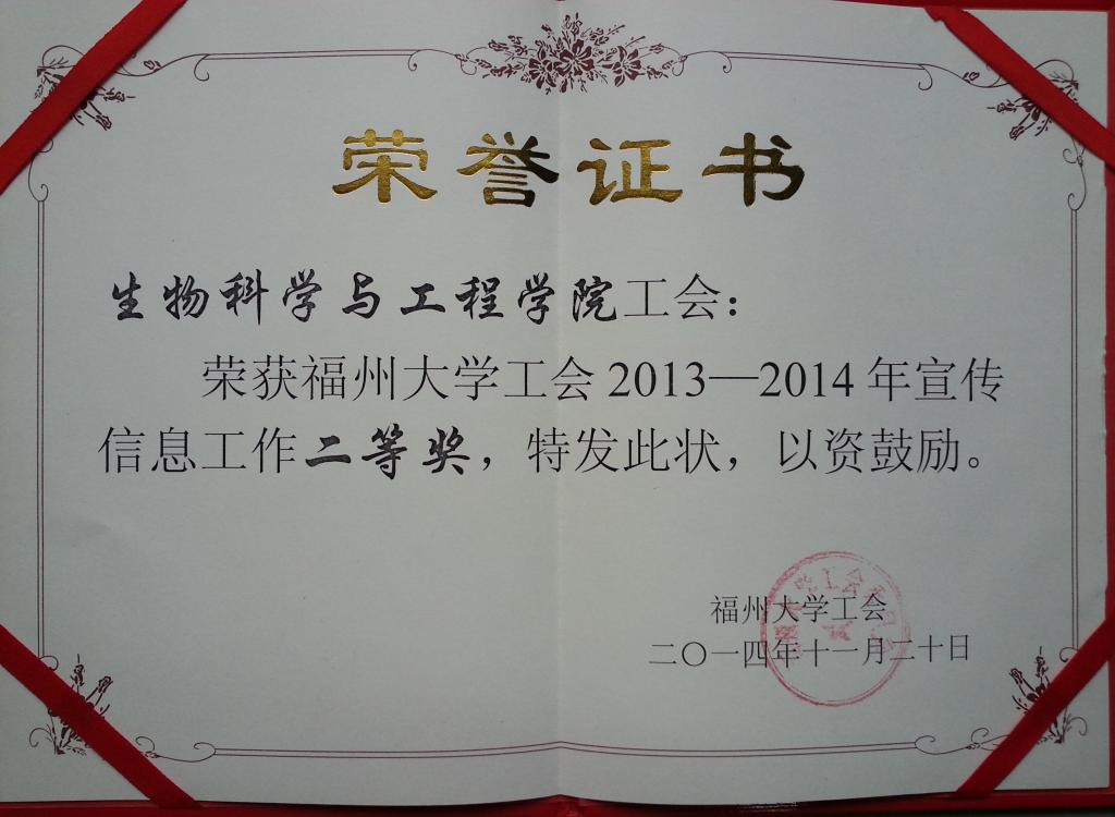 祝賀我院工會榮獲福州大學工會2013-2014年宣傳信息工作二等獎