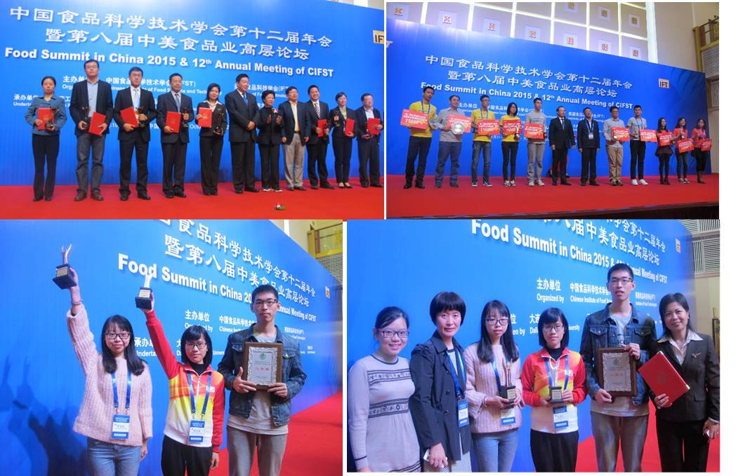 2015年10月20-22日,中國食品科學技術學會第十二屆年會暨第八屆中美食品業高層論壇在大連召開, 作為食品行業的年度盛會,會議受到了中國食品科技與產業界的高度關注,為期兩天的年會吸引了來自食品產業和科技界的1300余名代表參與,以娃哈哈宗慶后董事長為代表的數十家大型企業負責人的到會,彰顯了中國食品科技力量與產業創新需求正有效對接。在本次會議上,我院汪少蕓教授獲得“中國食品科學技術學會科技創新獎——杰出青年獎”和科技創新優秀論文二等獎,張雯副教授獲科技創新優秀論文三等獎;在倪莉教授和張雯副教授的指導下,我院王藝靜、林旺彬和胡釗穎等同學組成的創新團隊的作品“夏物語——奶香擂茶冰棒”和“五谷家味”在學生食品創新比賽中分獲杜邦海峽兩岸食品創新大賽二等獎和盼盼食品創新大賽三等獎,楊雪純、楊茹婷等同學的作品“閩式蒜蓉香辣醬”獲得李錦記杯學生創新大賽最佳工藝獎。