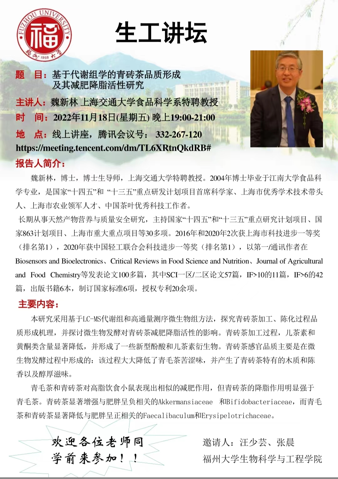 生工講壇:11月18日基于代謝組學的青磚茶品質形成 及其減肥降脂活性研究